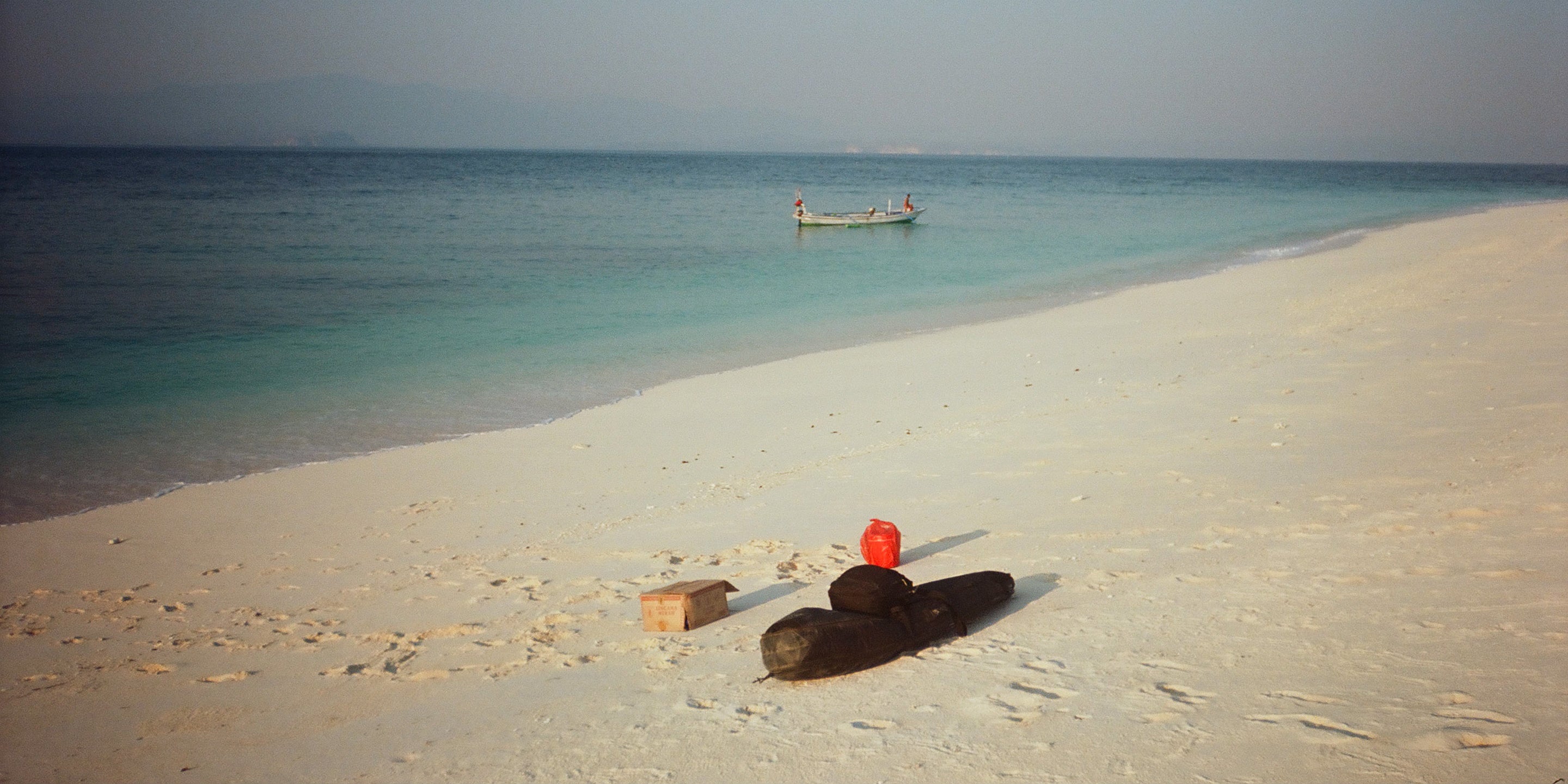 Webby and I got dropped on this uninhabited island 40km offshore, where we heard there was a wave, with just this. One board and board bag, a box filled with eight one-litre water bottles, a couple packs of biscuits and cigarettes, a backpack with camera gear, and a bucket of rice and dried squid. I have not been able to touch a piece of squid since.