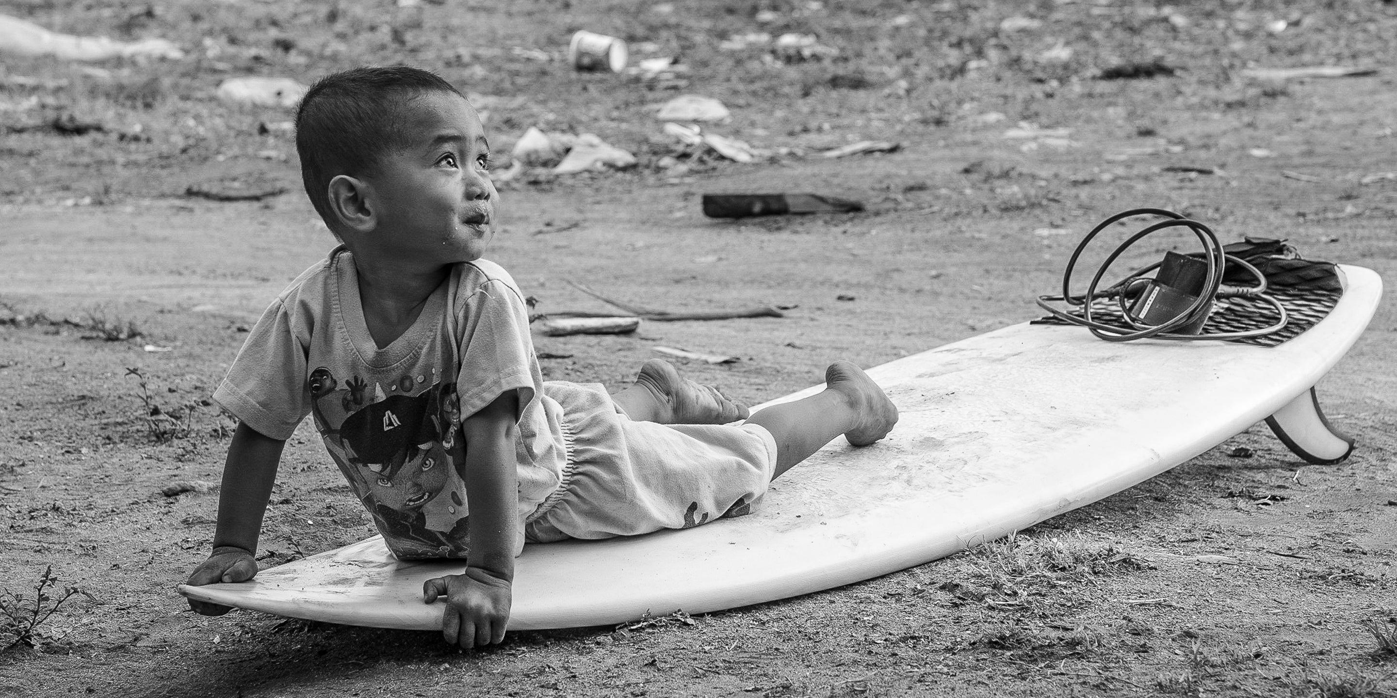 I surfed this wave on my own for four days. One day, I noticed something bobbing in the water just inside of me. It was too big to be a turtle, too brown to be a piece of rubbish. It was another surfer. Ependi was one of two local surfers, and he paddled out on a water-logged 5’7" with a legrope with no ankle strap that he held in his teeth. We became friends. At the end of my stay, I gave him one of my excess CREATURES legropes. This is his son, who he hopes to teach to surf one day.