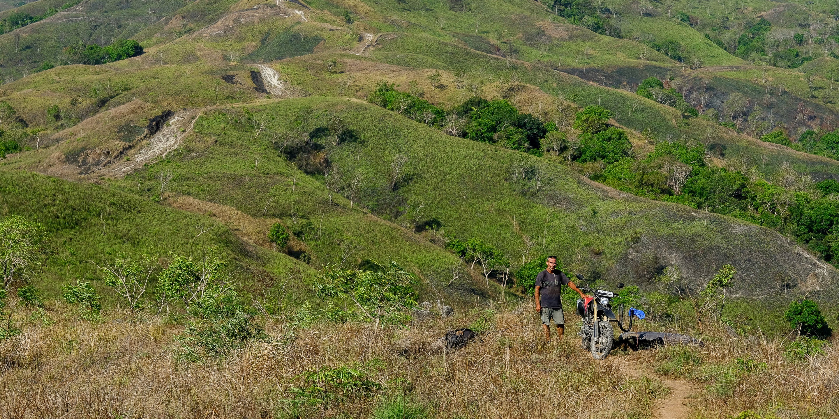 "After three days we ran out of food and water and went to ride back out. I got a flat tyre riding back up. Webby freaked out a bit, he wanted to ride back down and paddle out a couple miles out to the charter boat and try get a lift to the surf camp a couple bays back over, try to organise another boat to come and grab us and our bikes and all our gear. Eventually, we agreed he should just go back down to the fishing camp and see if they had a repair kit. He came back three hours later, also with a flat tyre, but the guys at the fishing camp had helped him strap it to the rim with rope to stop it from rolling off. He gave me a length of rope and we strapped my bike tyre up too. Man, it was so hard riding up that hill. I fell a fair few times and ended up snapping the front brake handle. I stalled so many times that I flattened my bike battery from restarting. So yeah, no brakes, no electric start, a flat tyre. Then I ran out of fuel. Webby was freaking by this point. It was really hot, we had no water, no food, no fuel. We ended up dumping all his gear in the bush and leaving my bike there. I wrote him a note in Indo asking for help and he rode off back to the village while I started walking. A couple hours later he came back with a local villager and fuel and water. I was so glad to see him! But yeah, definitely the two most important things in that situation were language and positivity. There is always a solution if you remain calm and positive. A huge part of survival is attitude. Positivity will always carry you through any kind of crisis. If you’re determined to find a solution, you always will."